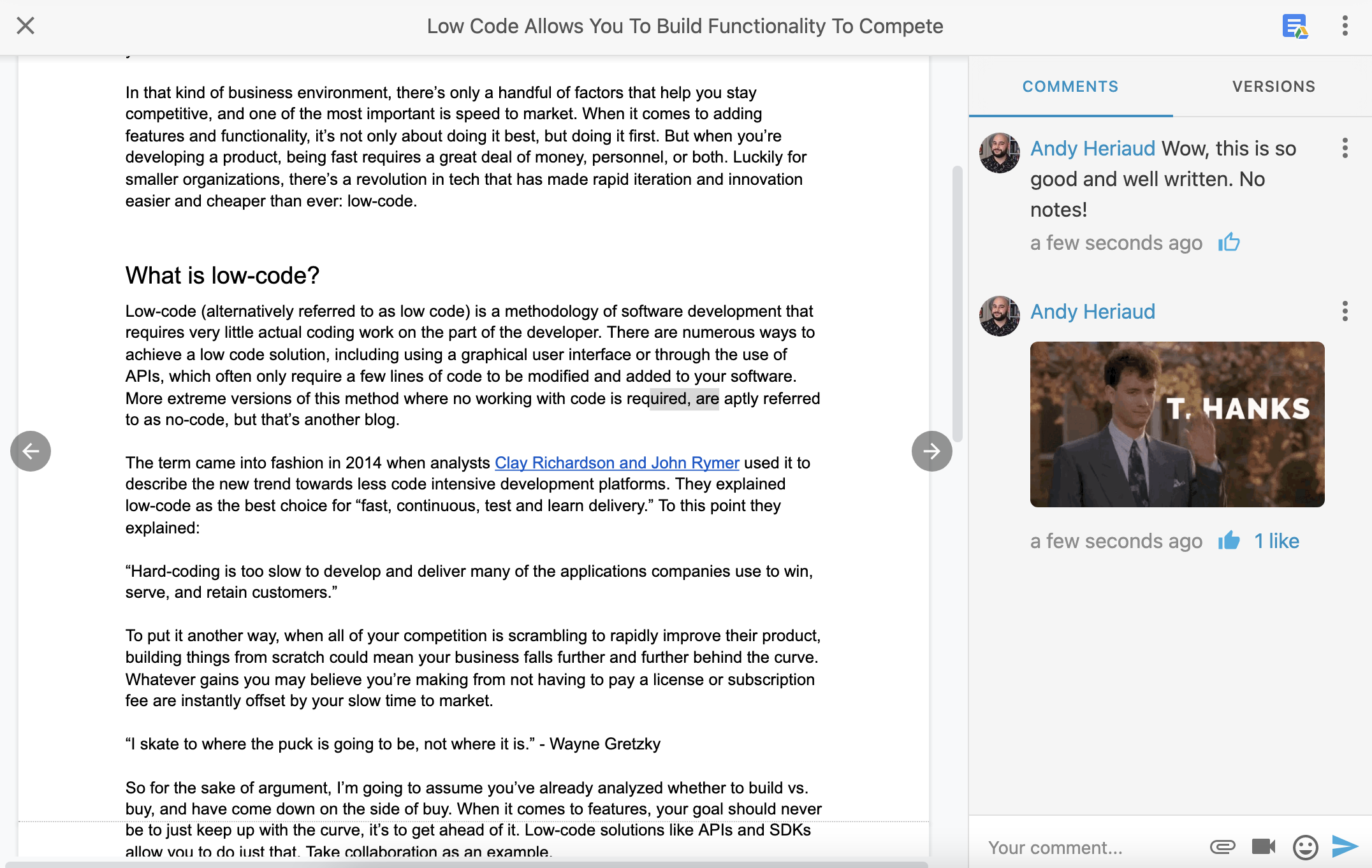 Right away the sales lead notices that a specific detail discussed in the last meeting isn’t reflected in the contract. With Weavy’s document collaboration, they can leave a comment and tag the CFO. Without ever having to leave the CRM, the CFO can go directly into the Word document and edit it. But then the CEO chimes in: they had a separate call with the client where they agreed to change that detail, the original version of the contract was correct. Luckily, both versions are capable of being previewed in the CRM, and are easily accessible.